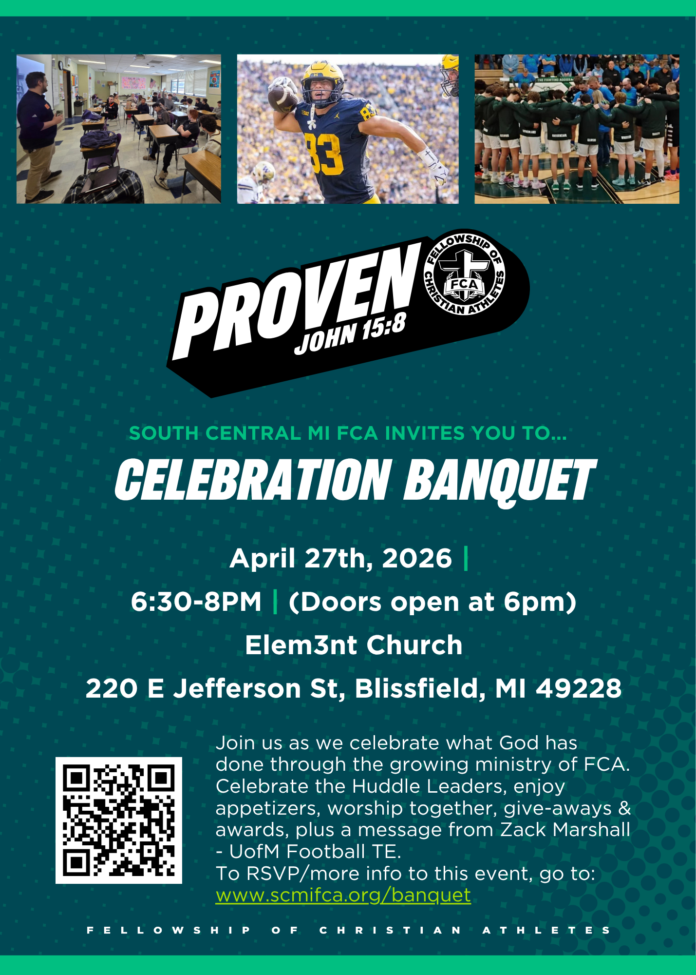 Celebrate what God is doing in the lives of athletes, students, coaches, leaders, schools, and communities through FCA! All students, Huddle coaches, nominees, award winners, families, and friends are welcome to attend! The Celebration Banquet is for everyone in South Central, MI - Jackson, Hillsdale, Lenawee, & Monroe Counties. There will be light food, FCA gear, games & prizes, award presentations, a Christian elite athlete presenting, and a panel of testimonies from students.